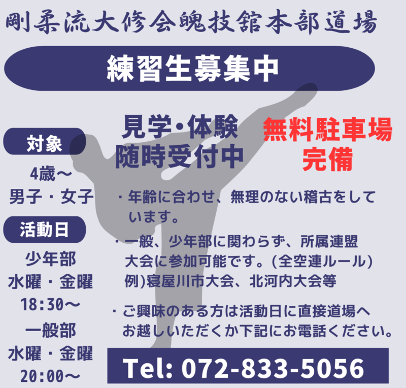 続きを読む大阪府寝屋川市・大阪府交野市 京都府京田辺市の空手道場【問い合わせ】TEL: 072-833-5056